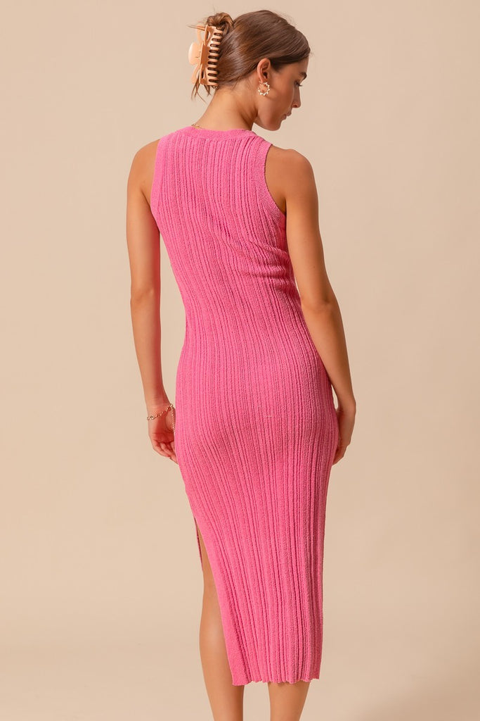 This midi dress brings versatility and style to your summer wardrobe. Made with a variegated stretchy rib fabric, it hugs your curves comfortably while providing a breezy fit. The side slit adds a playful touch, perfect for any occasion. Made from 100% polyester, it's lightweight and easy to care for.